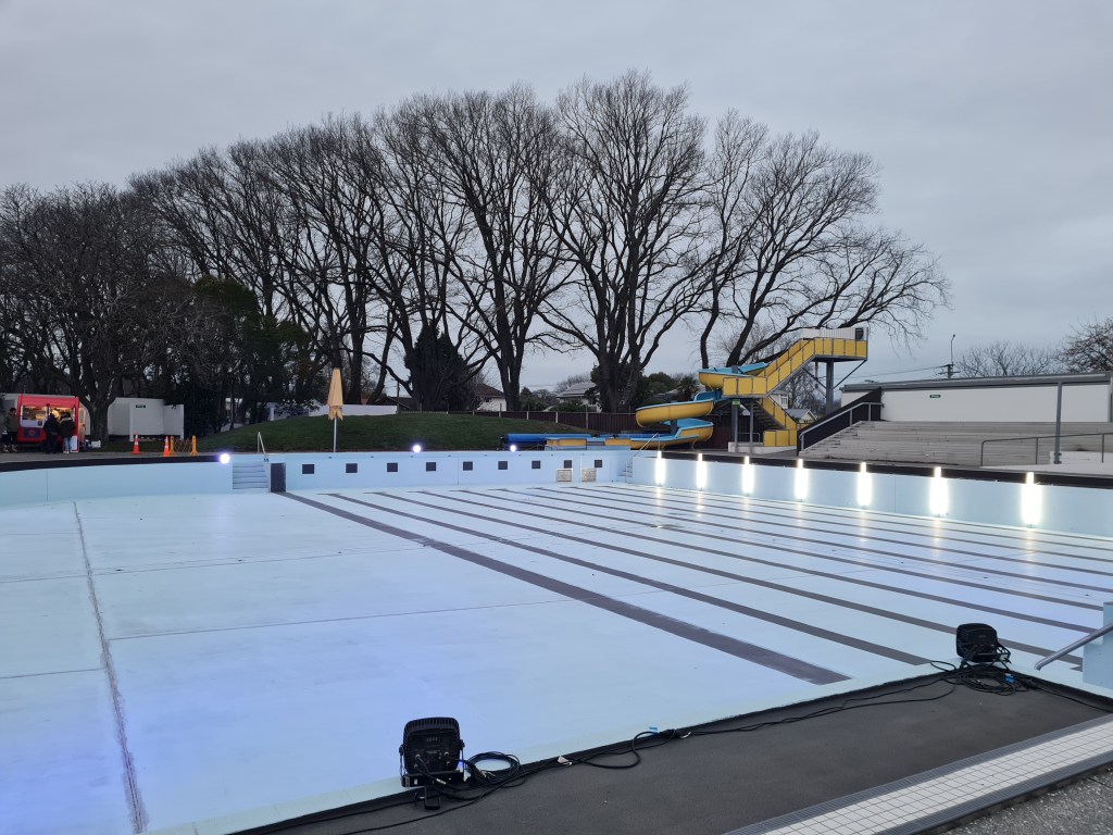It’s close to dusk on what’s nearly the shortest day of the year, and it’s bloody cold. We’re sitting at picnic tables and deck chairs, wrapped in blankets and clutching hot water bottles, at the shallow end of Waltham Pool. It’s drained for the winter and stickered with dead leaves. At the far end of the pool there’s a dismantled hydroslide, jaunty in its yellows and blues. The trees at the park over the fence are skeletal, and the clouded sky is fast approaching a gunmetal grey. We can hear distant traffic. Geese honk overhead, flying towards the Ōpāwaho Heathcote river over the road.