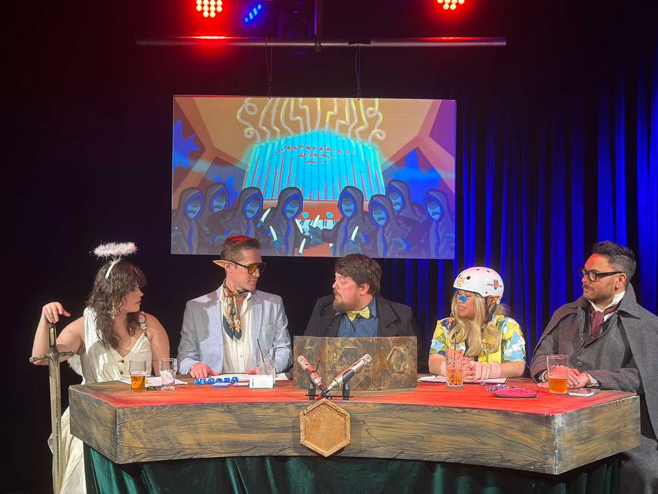 It is a live theatre show where comedians* play Dungeons & Dragons** in front of an audience. If you come to a show you’ll see five of us onstage sitting at a table. The Dungeon Master (me), will describe the scenario I have planned out, the other four will improvise what their character wants to do, and we work out what happens by rolling dice. What sets it apart from playing a game at home is the music, the lighting, the costumes. There are also real-time illustrations from animator Andrew Kepple, who is up in Auckland watching the livestream, which are projected onto a screen behind us.