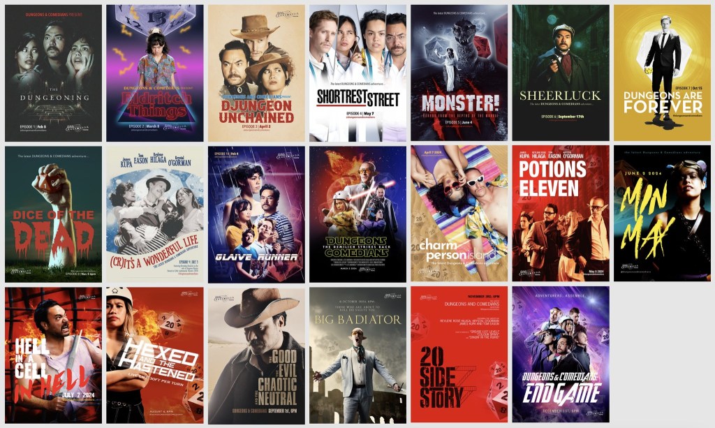 There’s this interesting tension – on one hand, improvised comedy and tabletop roleplaying games are both formats that celebrate spontaneity, strong offers, interesting choices, and so on – there’s a lot of yes-and-ing. On the other hand, in planning the campaign, you’ve clearly thought through not just a rough arc, but also how each ‘episode’ can sit within different genres, which shape individual episodes. Can you talk a bit about that?
