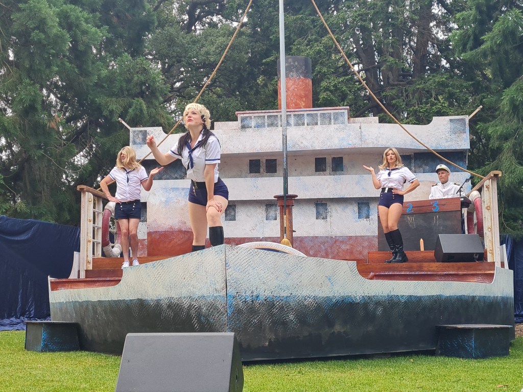 The film might be nearly thirty years old (yikes), but the show carefully pitches its pop culture references and jokes across generations; everyone gets to feel a bit smart, and us 90s teens can relive some key Spice Girls and Steps choreo. It prioritises big characterisation and physical comedy over intricate wordplay, although those interested in bad puns and light smut won’t be disappointed. The performers move throughout the audience area, and up and down the levels of Chris Reddington’s simple but effective set, which points the bow of the ship straight at us. The production’s layout on the Archery Lawn is also great – preferable, I think, to previous years’ locations elsewhere in the Gardens.