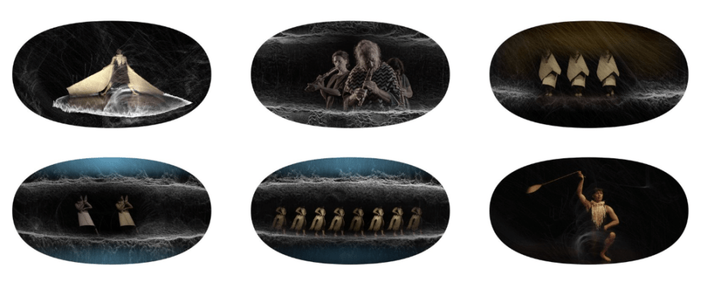 Pepe is a 15-minute dance video work, although that sounds a little reductive for something that combines experimental digital media, filmed contemporary dance (kanikani) and taonga pūoro (traditional Māori instrument) performances, animated elements, costuming, and raranga (weaving) into a hypnotic and fascinating whole.
