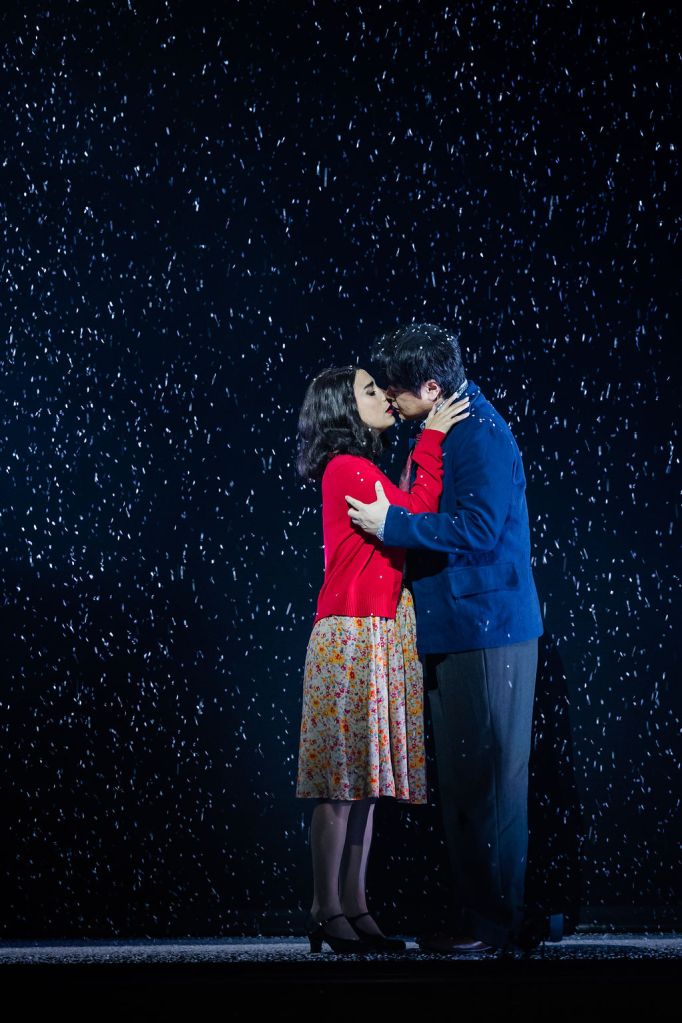 Ravella keeps the action in Paris, but places us in 1947 amidst the shock and dawning optimism of the post-war period. It’s a lean and brisk production that brings the characters of the cheerful but impoverished bohemian artists to the fore. You cannot help but fall in love with writer Rodolfo, played with immense charm by tenor Ji-Min Park, as he meets and falls for Mimí (soprano Elena Perroni, exhibiting exquisite musicality), a seamstress with a very suspicious cough. They spend time at a café with their friends, philosopher Colline (baritone Hadleigh Adams) and musician Schaunard (baritone Benson Wilson), where painter Marcello (baritone Samuel Dundas) is reunited with sultry past lover Musetta (soprano Emma Pearson). Mimí’s illness develops, and relationships fray as the artists do their best to find her care. The performers render the relationships vividly and sympathetically, with strong physicality and a fine eye for character detail.